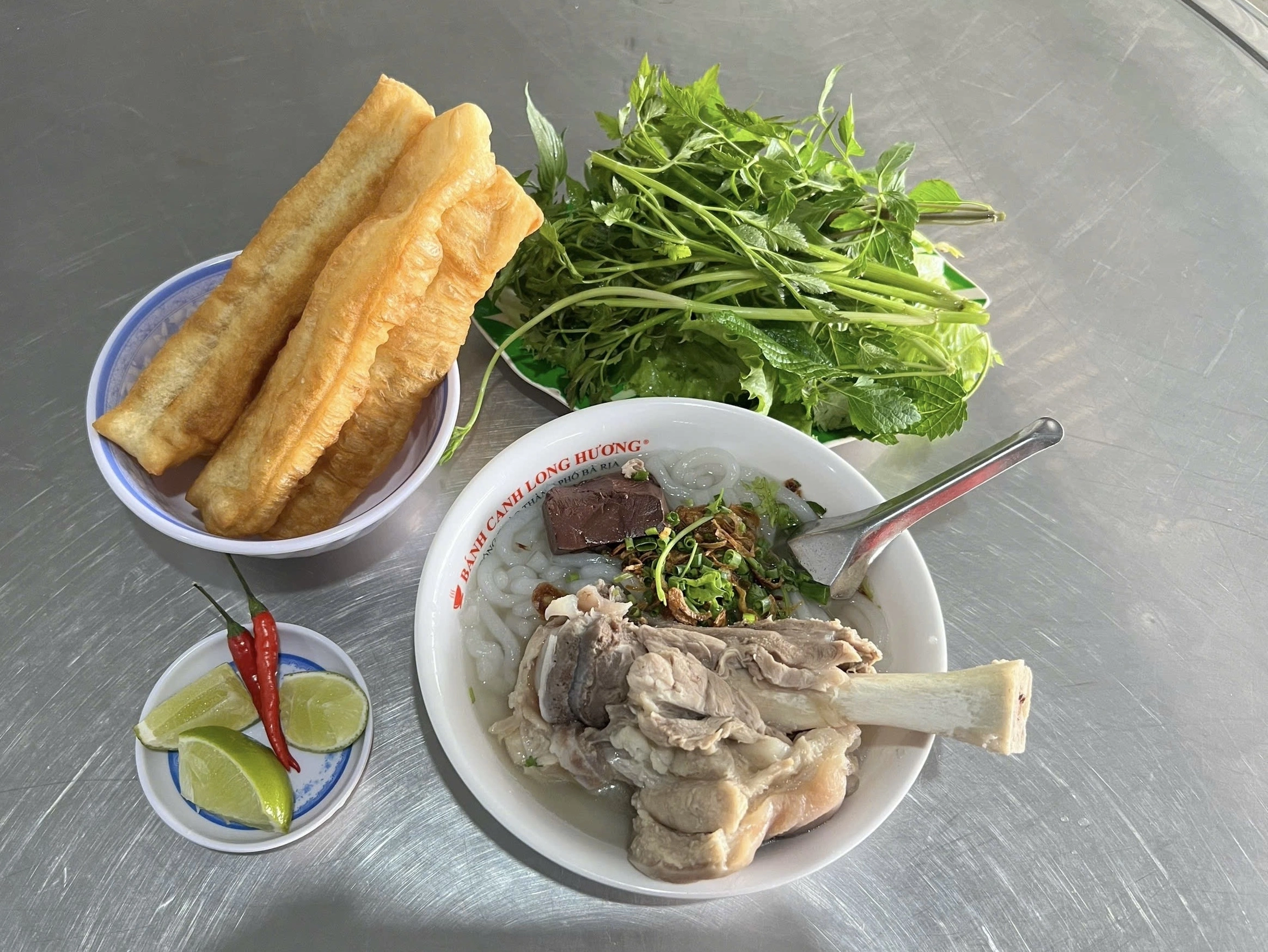 Nằm ngay cổng chào Bà Rịa, hàng bánh canh Long Hương thường xuyên đông khách, đặc biệt dịp cuối tuần, với đặc sản là bánh canh xương que nạc.