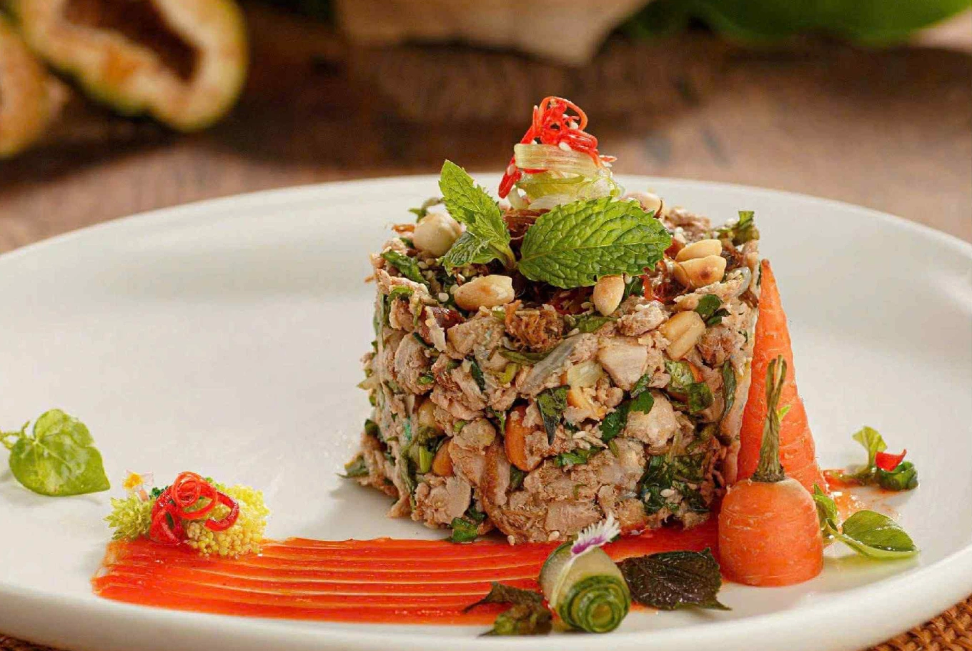 Thành phẩm là món gỏi thanh mát, có vị bùi gần giống thịt, thưởng thức cùng trà quýt. Vừa dùng bữa, đầu bếp Nhiên chia sẻ với khách tham gia lớp về làn sóng ăn chay mới ở Huế, chú trọng sức khỏe và nguồn thực phẩm bền vững. Người Huế vốn ăn chay theo ngày lễ Phật, nhưng trước đây chỉ cần không có thịt là được, kể cả đồ ăn nhanh.