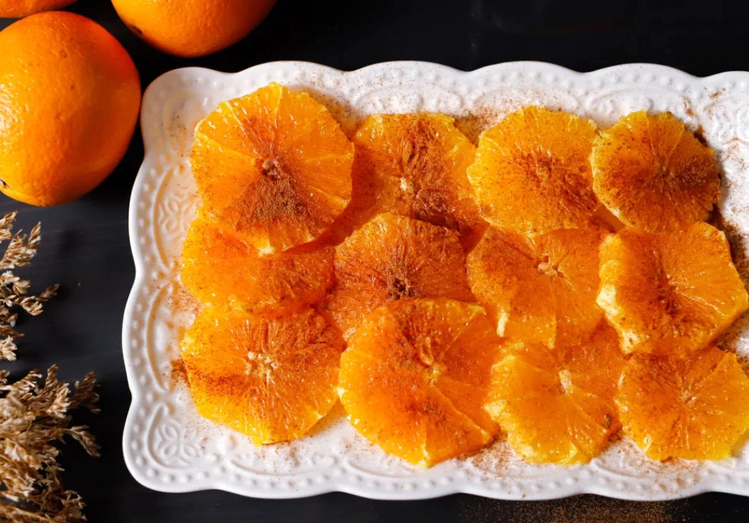 Cam tươi gọt vỏ, thái lát và rắc đường quế lên trên là món ăn được nhiều người yêu thích tại Morocco. Ảnh: Plantbased passport
